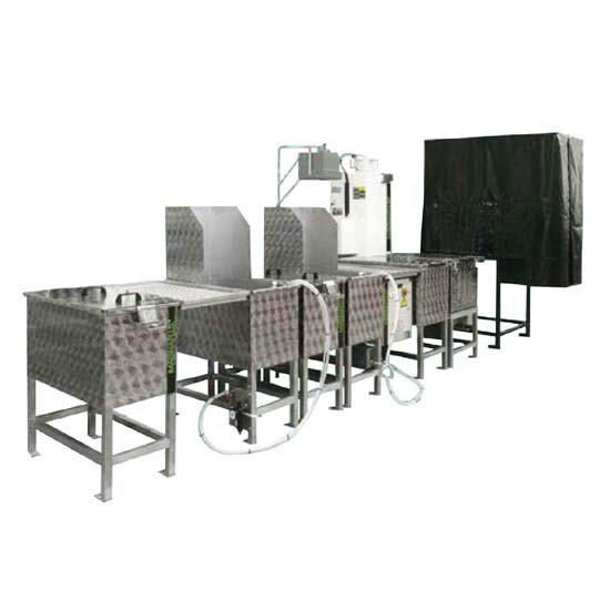 В состав линии входит 7 компонентов: бак для пенетранта, бак для предварительной промывки, бак для эмульгатора, бак для окончательной промывки, сушильная камера, "шторм"-камера для нанесения сухого проявителя, смотровая кабина.