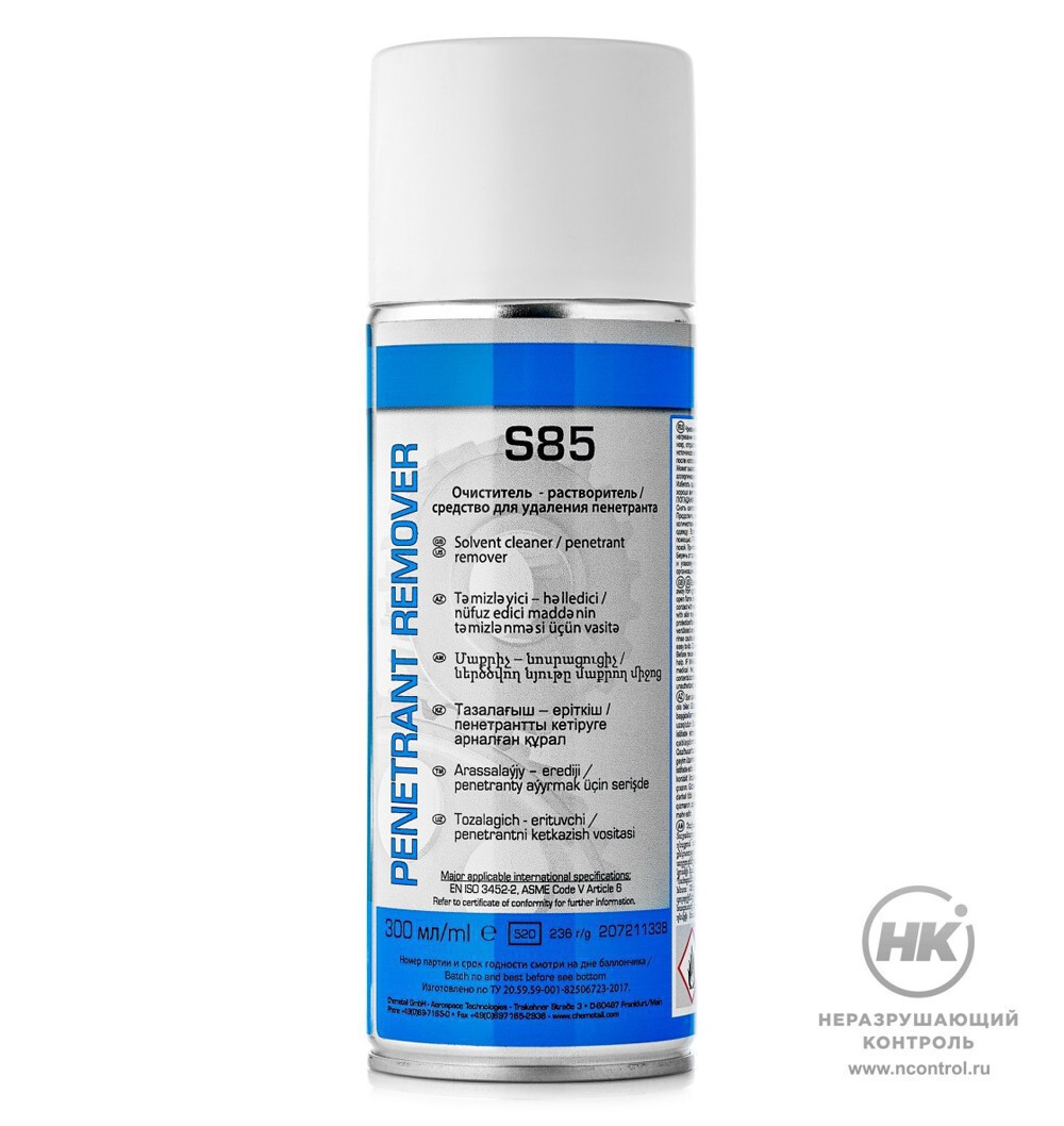 Очиститель S85 представляет собой быстросохнущую, прозрачную, подвижную жидкость. Выпускается готовым к применению в форме аэрозоля либо жидкости в канистрах. Служит для предварительной и промежуточной очистки тестируемых поверхностей. Никогда не наносите средство на этапе удаления пенетранта путём прямого распыления или погружения, так как это приведёт к потере чувствительности процесса.