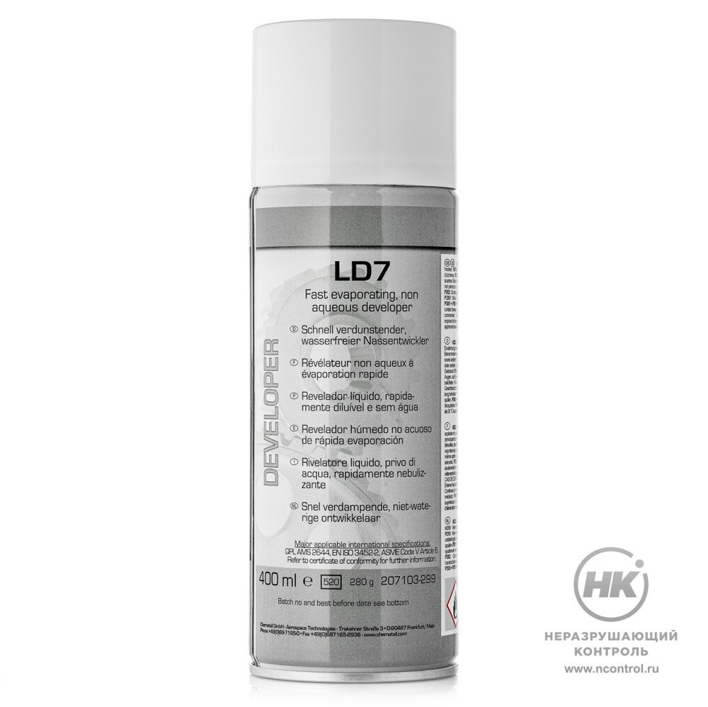 LD7 — быстро испаряющийся жидкий проявитель на неводной основе. Применяется в капиллярной дефектоскопии для контроля кованых и выплавляемых деталей, сварных швов, отливок. Используется вместе с пенетрантом Checkmor 240 и очистителем S76 для выявления индикаторных следов выходящих на поверхность дефектов.