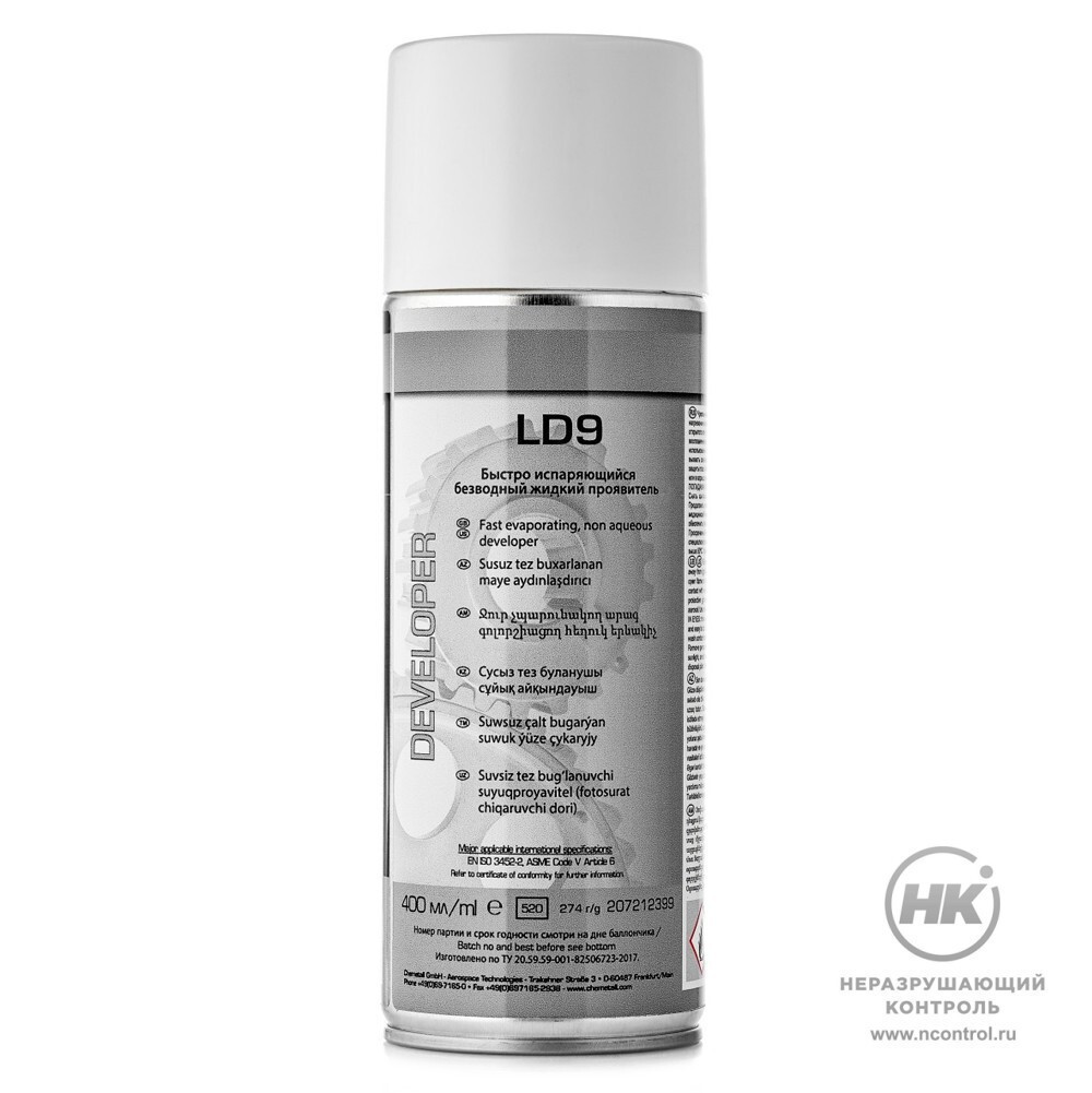 Проявитель LD9 представляет собой готовую к применению суспензию инертного белого порошка в растворителе. Выпускается в форме аэрозоля либо жидкости в канистрах. Используется в капиллярном неразрушающем контроле сварных соединений, литых и кованых деталей. Обеспечивает отличные результаты как с цветоконтрастными, так и с флюоресцентными пенетрантами производства Chemetall.