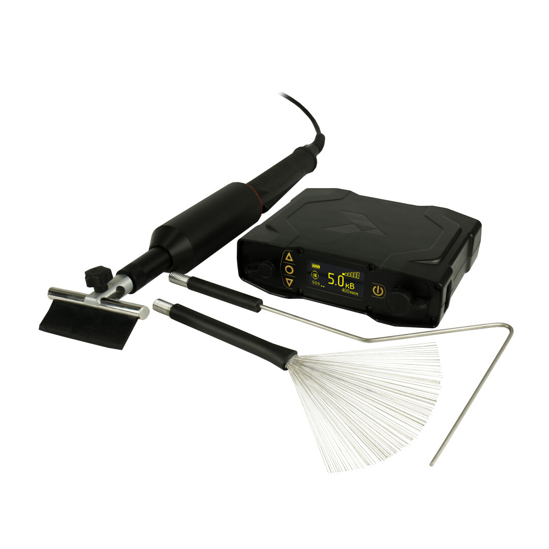 Принцип действия основан на приложении импульсного высоковольтного напряжения и фиксации электрического пробоя в местах дефектов. Электроискровой метод обладает высокой чувствительностью и производительностью при выявлении дефектов. Для прибора предусмотрена широкая номенклатура сменных электродов для контроля наружных и внутренних покрытий труб.