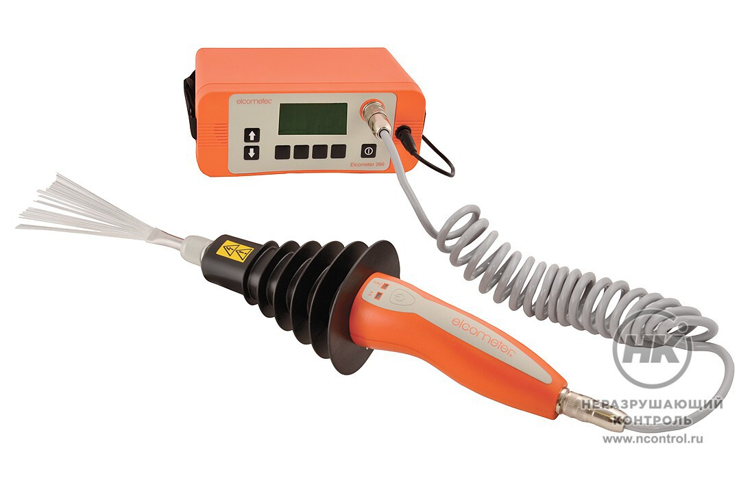 Elcometer 266 — электроискровой дефектоскоп с максимальным рабочим напряжением 5 кВ, 15 кВ или 30 кВ в зависимости от выбранной в комплектации рукоятки. Предназначен для ручной проверки качества диэлектрических и частично проводящих покрытий на токопроводящих основаниях. Позволяет выявить пропуски, утонения, включения, микроотверстия в сухих изоляционных покрытиях в диапазоне толщин от 200 мкм до 7 мм.
