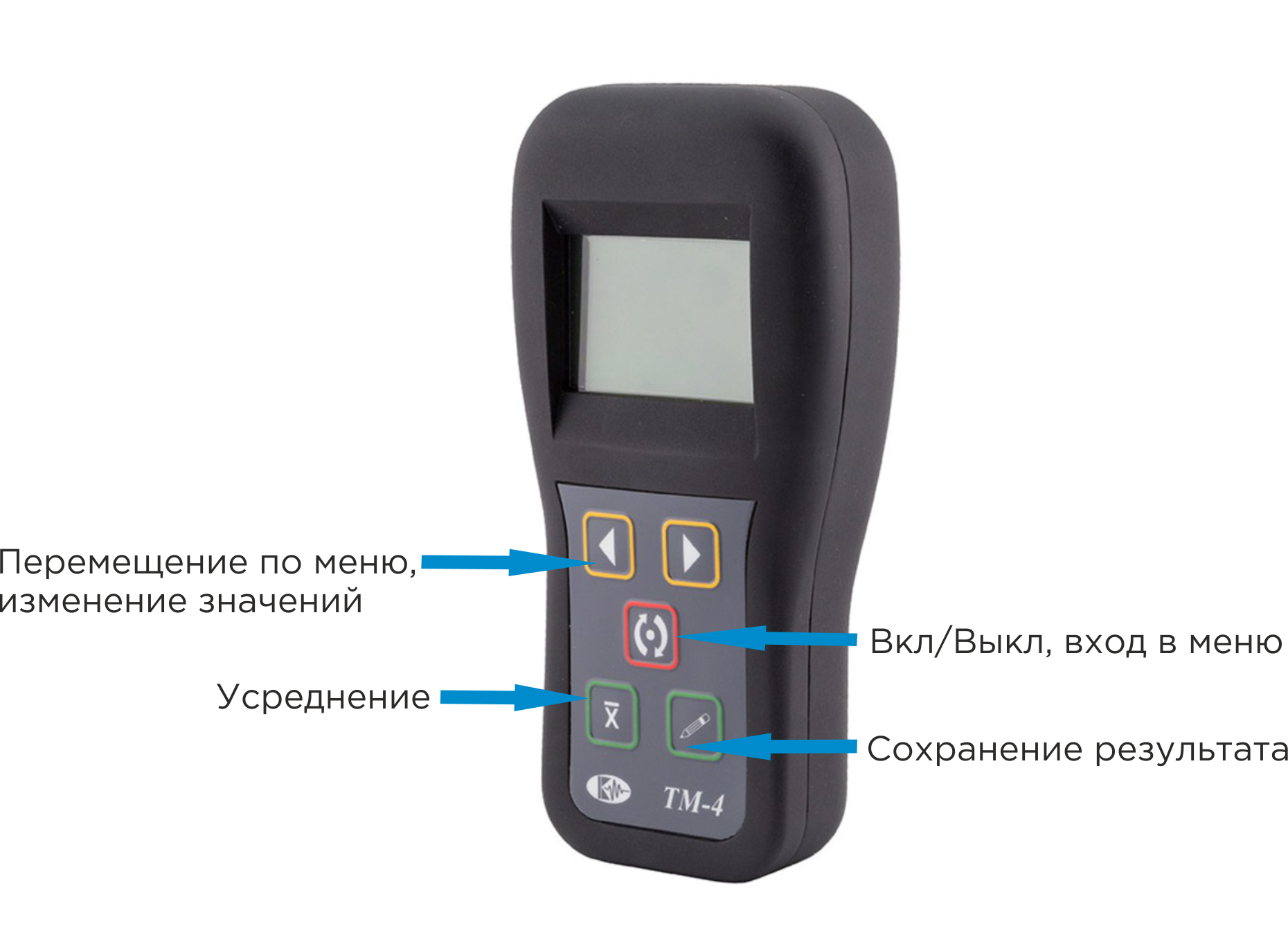 Клавиатура устройства разработана таким образом, чтобы оператор мог легко и быстро получить доступ к любой функции толщиномера. Кнопки расположены так, чтобы их было удобно нажимать в перчатках, имеют нескользящее рельефное покрытие. Функции кнопок зависят от состояния прибора и выбранного пункта меню.