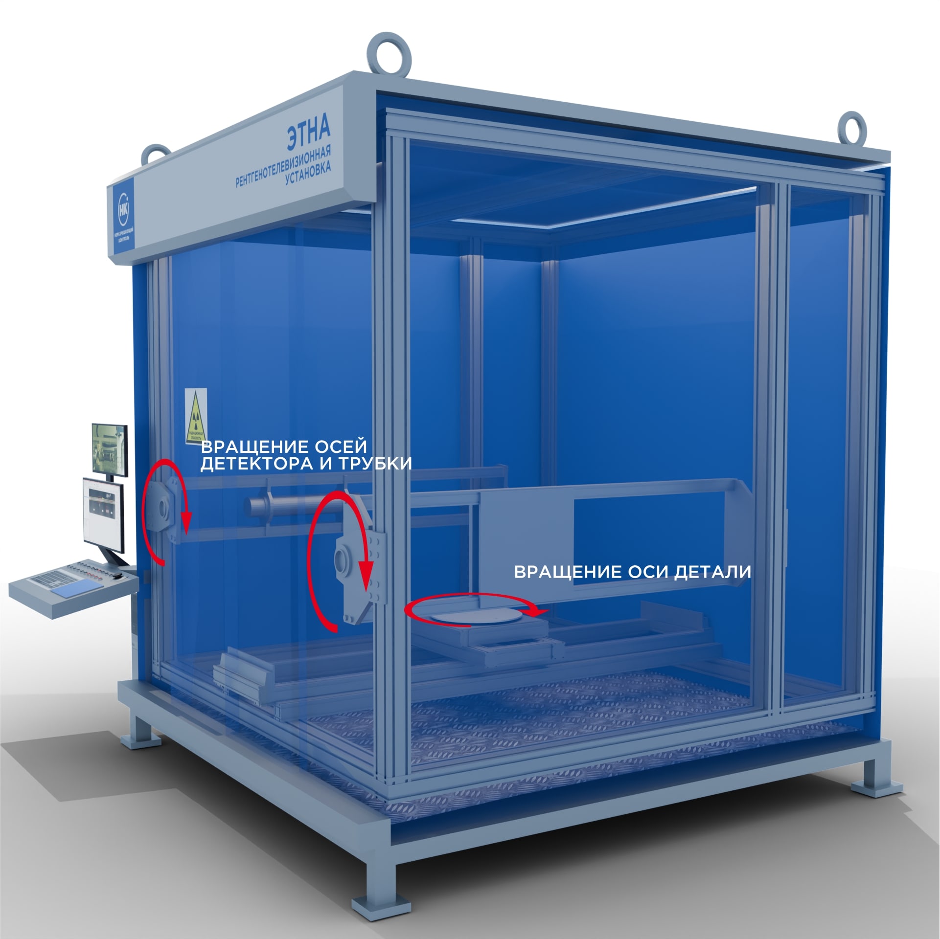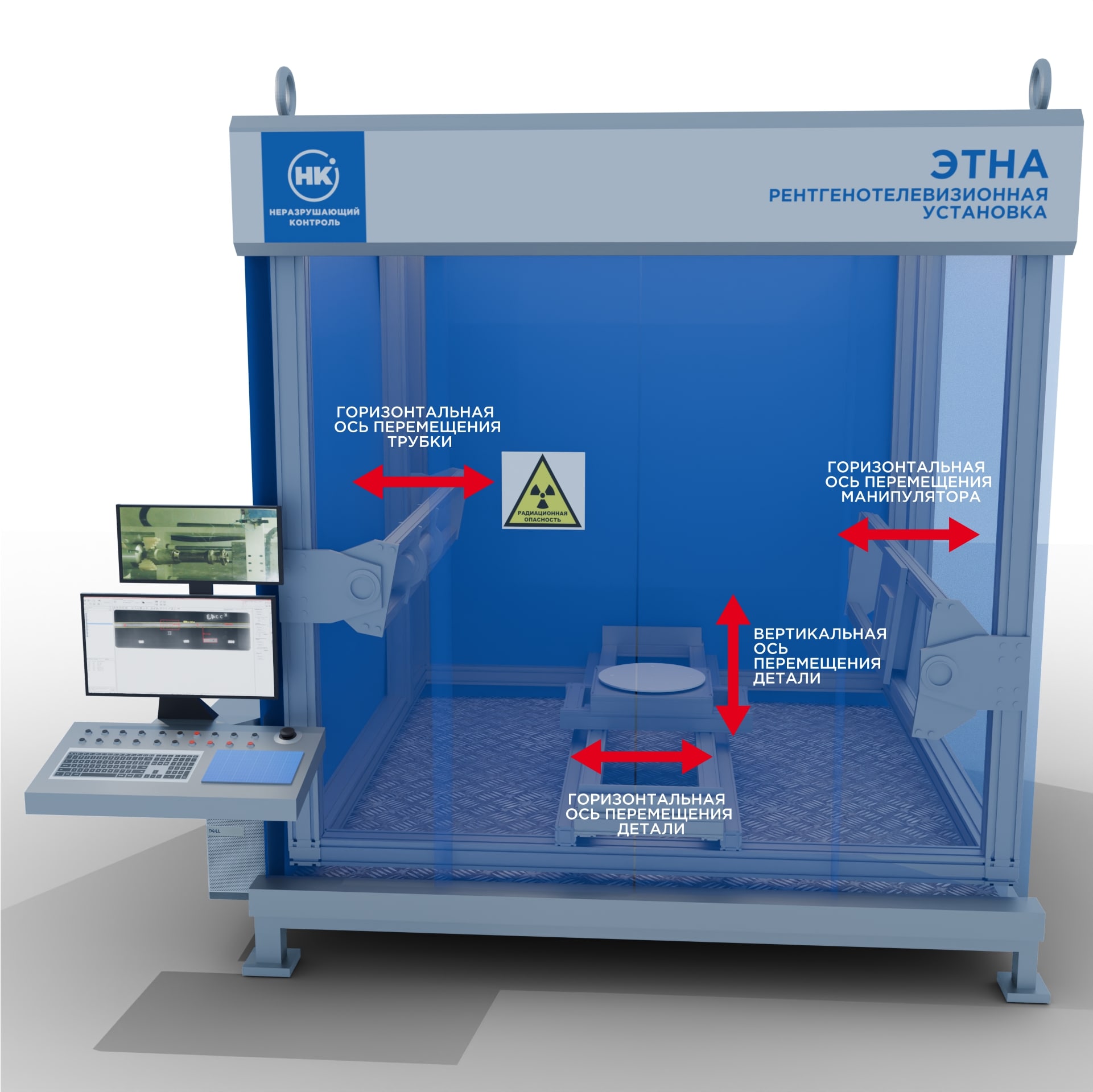 В состав установки входит система манипуляторов, которая может иметь 12 осей перемещения, дополнительные оси перемещения можно реализовывать с помощью дополнительных приспособлений: ролики, кран-балки и т.п., что позволяет подобрать оптимальный ракурс для контроля объектов с нестандартной геометрией. Независимые оси рентгенотелевизионной системы позволяют точечно позиционировать источник и детектор под любыми углами и решать широкий спектр задач, требующих особого внимания и вариативности расположения объекта контроля.