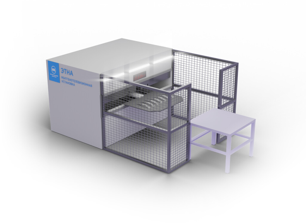 Уникальная особенность - загрузочные столы, работающие в тандеме, позволяют проводить одновременно сканирование образов и потоковую загрузку следующей партии. Установка представляет собой стационарный комплекс, состоящий из камеры радиационной защиты, c-arm манипулятора с двухсекционным загрузочным столом, рентгеновского аппарата, КЦР «Цифракон» и системы автоматизированного управления.