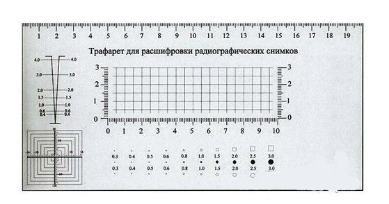 Трафарет выполнен в виде гибкой прозрачной пленки с нанесенными на ней миллиметровыми шкалами и изображениями окружностей и квадратов определенных размеров.