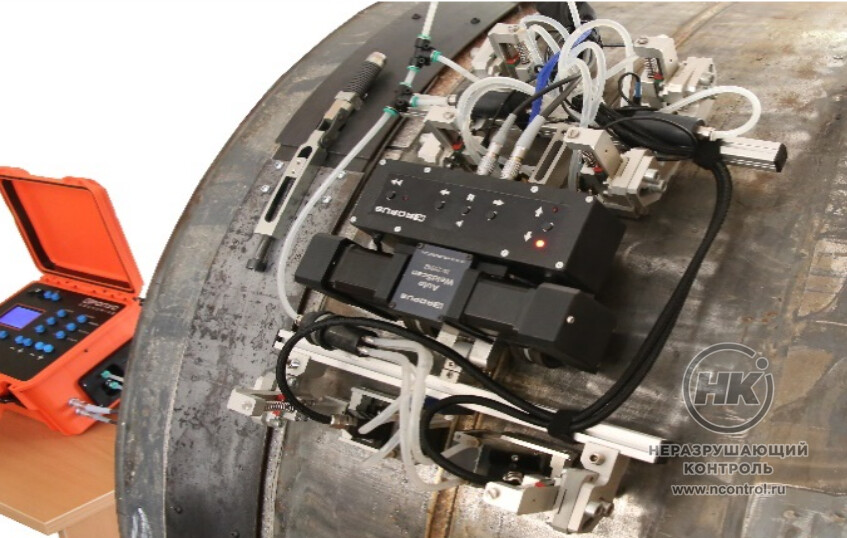 Двухмоторный сканер Auto Weldscan с плавающей подвеской предназначен для двухстороннего ультразвукового контроля сварных швов труб диаметром от 400 мм.