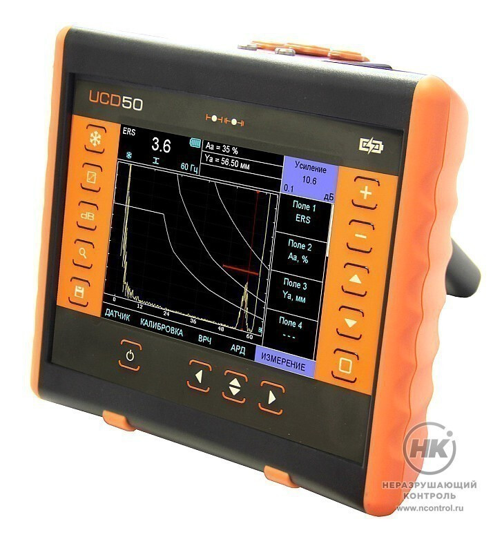 Дефектоскоп оснащён автоматической калибровкой преобразователей, функциями ВРЧ, АРК, АРД с привязкой по чувствительности, Б-сканом, TOFD и режимом огибающей. А вход энкодера позволяет подключать различные сканеры для построения B-сканов и TOFD развертки контролируемого участка изделия.