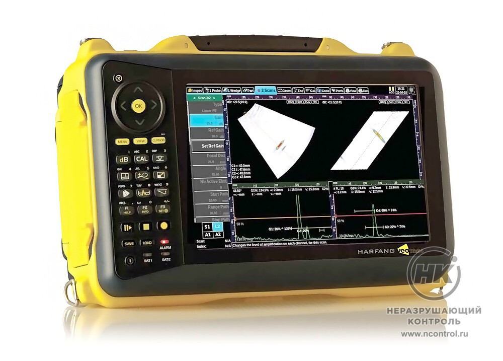 Ультразвуковой дефектоскоп на фазированной решётке HARFANG VEO предназначен для контроля сварных соединений, составления карты коррозии и контроля композитных материалов. Позволяет работать с ФАР преобразователями до 64 элементов, отображая S-скан, L-скан, виды сверху и сбоку в реальном времени. Встроенный TOFD.